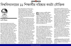জগন্নাথ বিশ্ববিদ্যালয় প্রশাসন ১১ জন শিক্ষার্থীকে বহিষ্কার করেছে! গত ২৪ মার্চ জগন্নাথ বিশ্ববিদ্যালয়ের কিছু শিক্ষার্থী দ্রব্যমূল্য বৃদ্ধির প্রতিবাদে মিছিলে অংশ নেয়। তারই ভিত্তিতে রাতের আধারে বাসায় তল্লাশি চালিয়ে শিক্ষার্থীদেরকে গ্রেফতার করে। তবে বিশ্ববিদ্যালয় প্রশাসন কোন বাছবিচার না করে পুলিশ তাদের গ্রেফতার করেছে এবং তারা সরকার বিরোধী মিছিল করে বিশ্ববিদ্যালয়ের ভাবমূর্তি নষ্ট করেছে বলে অভিযোগ এনে ১১ জন শিক্ষার্থীকে বহিষ্কার করেছে।